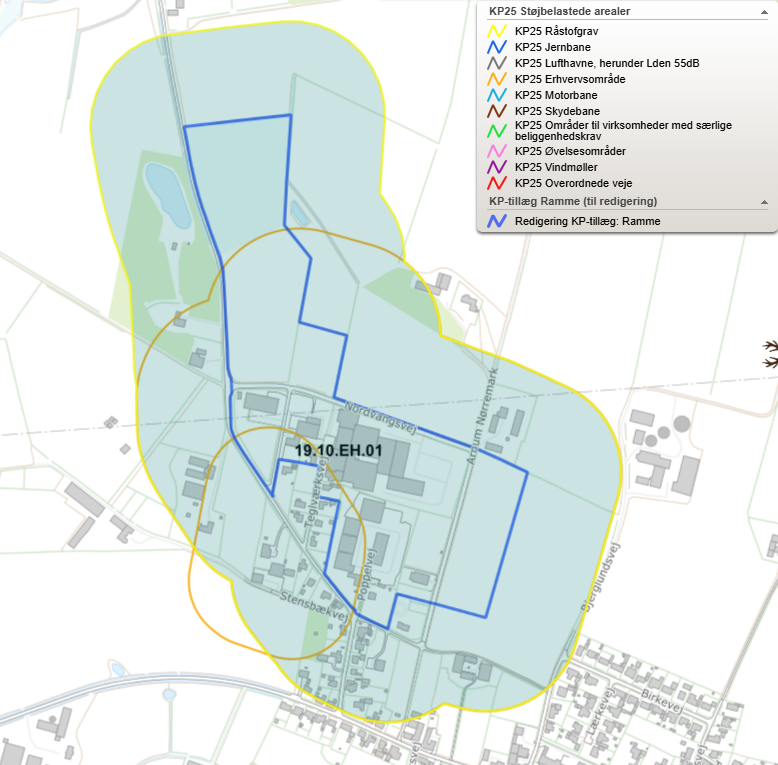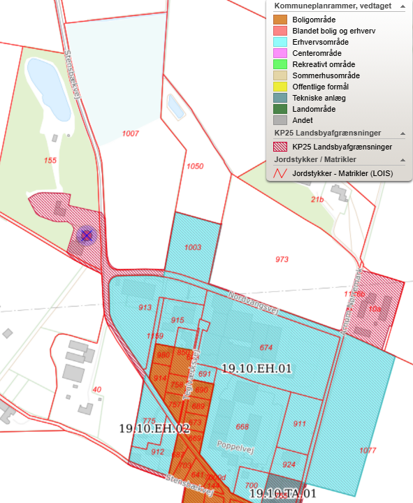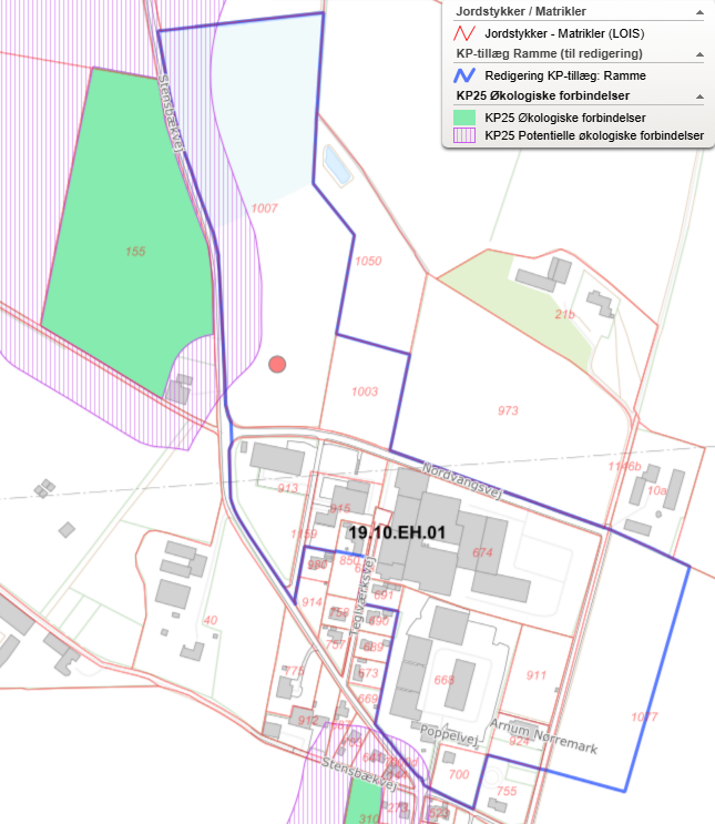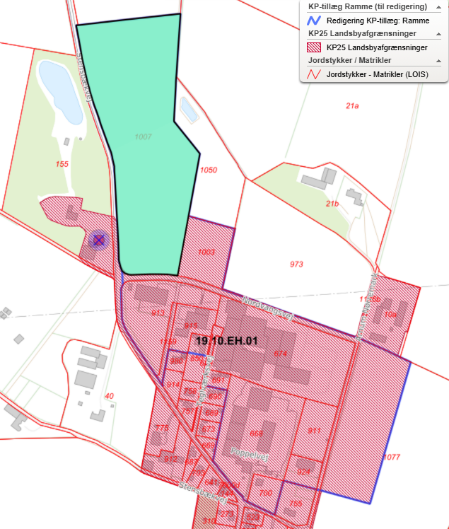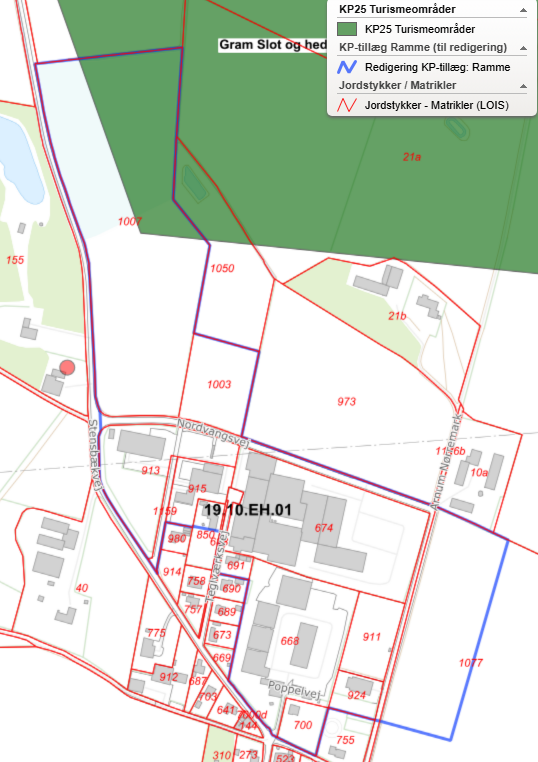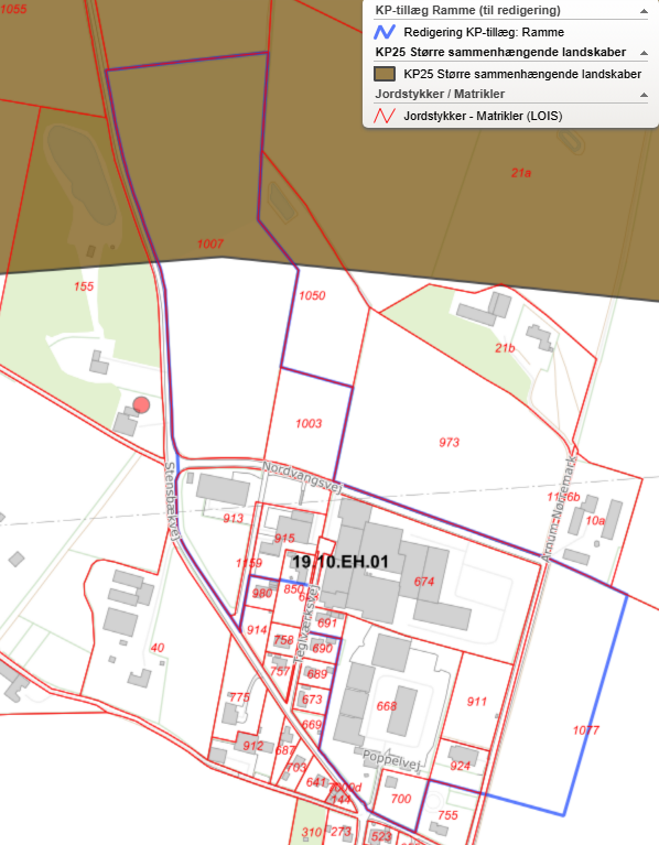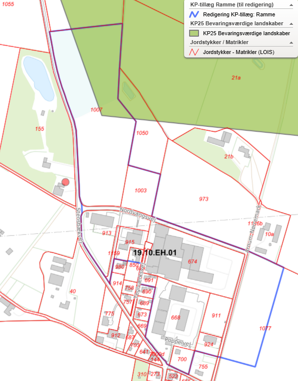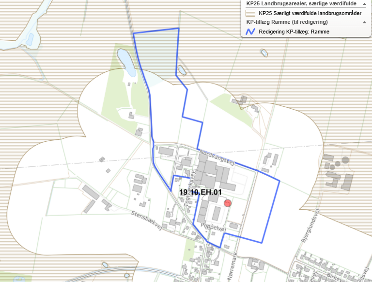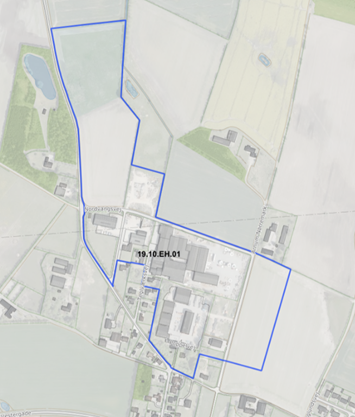 Udvidelsen ændrer rammeområdets geometri, og der er derfor tale om en redigering af den eksisterende ramme. Konkret indebærer det, at rammeområde 19.10.EH.01 ophæves i sin nuværende form og genoprettes med en justeret afgrænsning, der inkluderer matrikel 1007. Alle gældende rammebestemmelser videreføres uændret i den nye ramme. Rammebestemmelser og geometrisk afgrænsning for det omtalte rammeområde fremgår af de følgende sider.