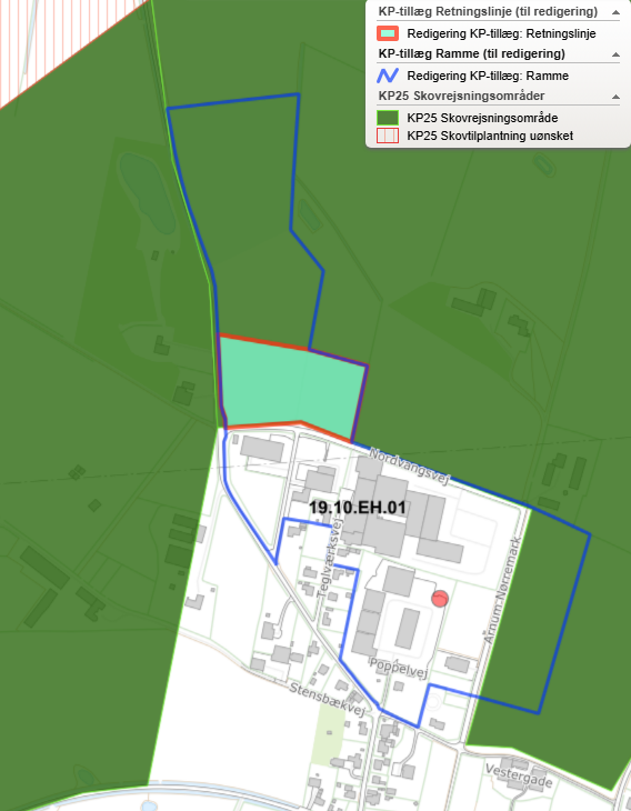 Skovrejsningsområder defineres i kommuneplanen 2025 som områder hvor skovrejsning er ønsket. Udlægget indenfor rammeområdet sker delvist på et areal, som er udpeget som område hvor skovrejsnings er ønsket. Det indebærer, at skovrejsning er ønskelig og mulig, men ikke eksklusivt bindende for områdets anvendelse. Med realisering af rammeområdet vil hovedparten af matrikel nr. 1007 anvendes til regnvandshåndtering, og derudover nye bevoksninger, hvilket ligger i tråd med retningslinjen. Kommuneplantillæg 19.10.EH.01 indebærer en mindre justering af udpegning af områder hvor skovrejsning er ønsket, hvilket indebærer at i Kommuneplanen vil matrikel nr. 1003 og den sydlige del af matrikel nr. 1007 fjernes fra områder hvor skovrejsning er ønsket. Området i kommuneplanen hvor skovrejsning er ønsket går fra 8.944 ha til 8.942 ha.