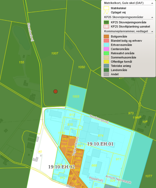 - I bestemmelserne for rammeområdet skal der indsættes krav om, at den nordlige del af matrikel 1007 skal friholdes for erhvervsmæssigt byggeri og anlæg. Der gives dog mulighed for etablering af bevoksning, regnvandshåndtering såsom regnvandsbassiner eller lignende, som kan tilpasses områdets karakter, samt mindre bygninger som bålhytter og shelters, der styrker de rekreative muligheder og understøtter arealets status som bevaringsværdigt landskab.
