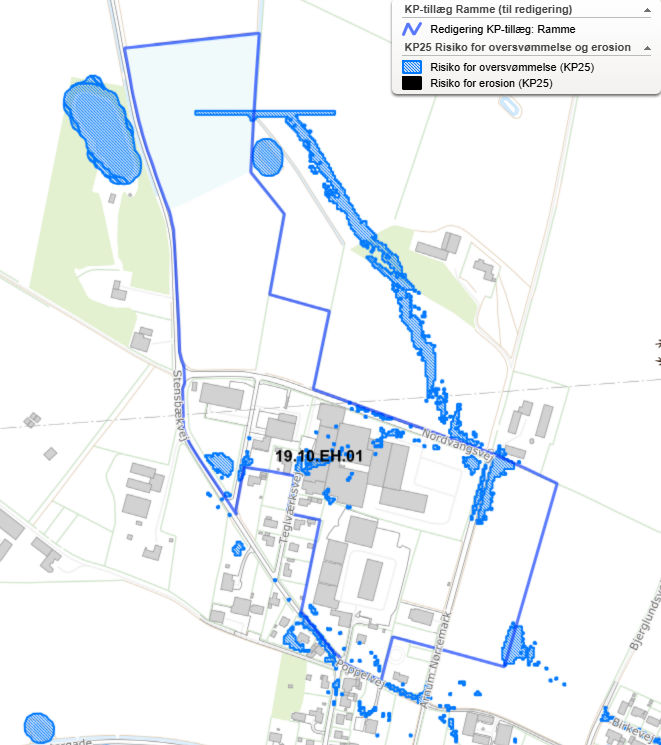 En mindre del af rammeområdet er omfattet af udpegning for oversvømmelse og erosion for enkelte mindre områder. Udvidelsen af den eksisterende ramme giver ikke mulighed for at opføre bebyggelse, men giver mulighed for regnvandshåndteringsanlæg i disse områder, og vurderes derfor værende i overensstemmelse med retningslinjen.